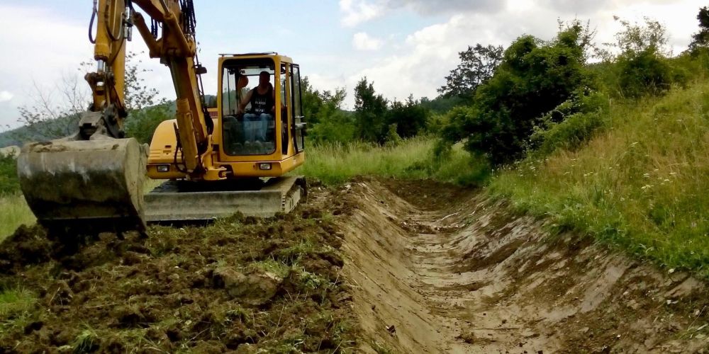 Während es Workshops werden Erdarbeiten mit einem Bagger, wie der Bau von Sickergräben und Terrassierungen am Hof durchgeführt.